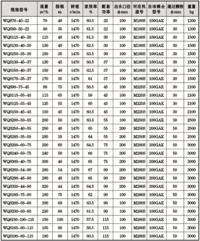 WQS系列深水型高扬程潜水排污泵是在长江三峡用潜水排污泵的研制基础上拓展形成的新产品。在研制过程中,充分运用了先进的CFD和流场诊断技术并进行了大量的实验研究,在水力部件设计和机构设计上突破了常规潜水排污泵的传统设计方法。该产品的研制成功,填补了高扬程深潜排污泵的空白,处于国际先进水平,也使我国泵行业的水力设计提高到了一个新的水平。