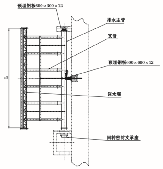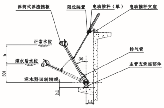 滗水器装在池内侧面两支墩上(俗称“牛腿”),两端设有回转支座,电动推杆减速装置安装在水池上方的支座上,电机运转时,电动推杆作往复直线运动,带动滗水机构绕回转支座中心作回转摆动。在曝气和沉淀阶段滗水堰位于水面以上,滗水时滗水堰通过控制系统下降至水面以下进行排水,当水位下降到最低水位完成滗水后,滗水器快速返回到初始状态。在滗水过程中进入滗水堰的水流呈层流状态,滗水器的下降速度使出水量保持稳定浮筒式浮渣挡板在滗水过程中起拦截水上悬浮物的作用。