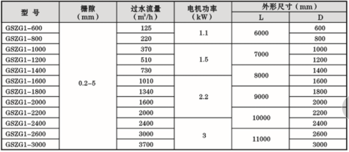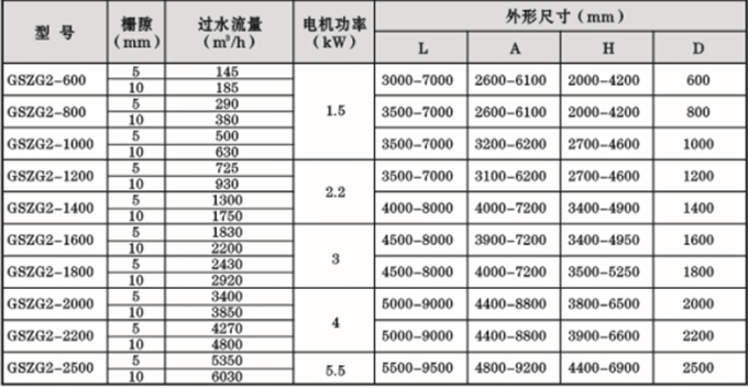注:过水流量为2mm栅隙时的过水量