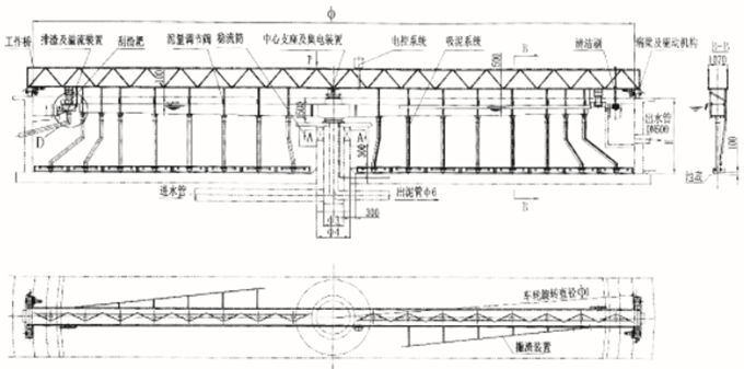 3/h)污水处理工程的幅流式沉淀池,特别适用于二沉池池底污泥的刮集和外排。池形一般采用中心进水、周边出水,中心排泥,池底可不设坡度(平底结构),二沉池使用尤为广泛。水面浮渣、浮沫等杂物可由浮渣刮集装置刮排至池外渣坑或渣斗。