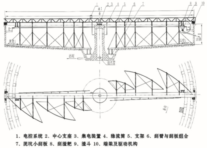 驱动装置推动工作桥沿池平面旋转,工作桥带动刮臂旋转,固定于刮臂上的刮板将泥由池边逐渐刮至池中心的集泥斗中。刮泥板曲线为对数螺旋线形,受力均匀,刮泥彻底,当池底遇有障碍物时,能自动让耙,保护机器不受伤害。驱动装置可设扭矩保护装置,工作更加安全。